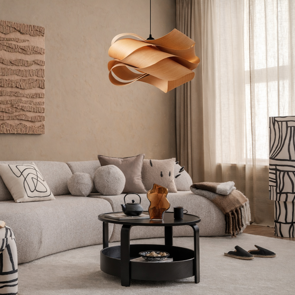 Diese wunderschöne Lampe bringt die Eleganz der Natur direkt in Ihr Zuhause. Mit ihrem einzigartigen, wellenförmigen Design aus Echtholz schafft sie eine harmonische Balance zwischen moderner Klarheit und organischer Ästhetik. Die fließenden Formen lassen das Licht sanft zwischen den gedrehten Schichten spielen und erzeugen in jedem Raum eine warme, einladende Atmosphäre.